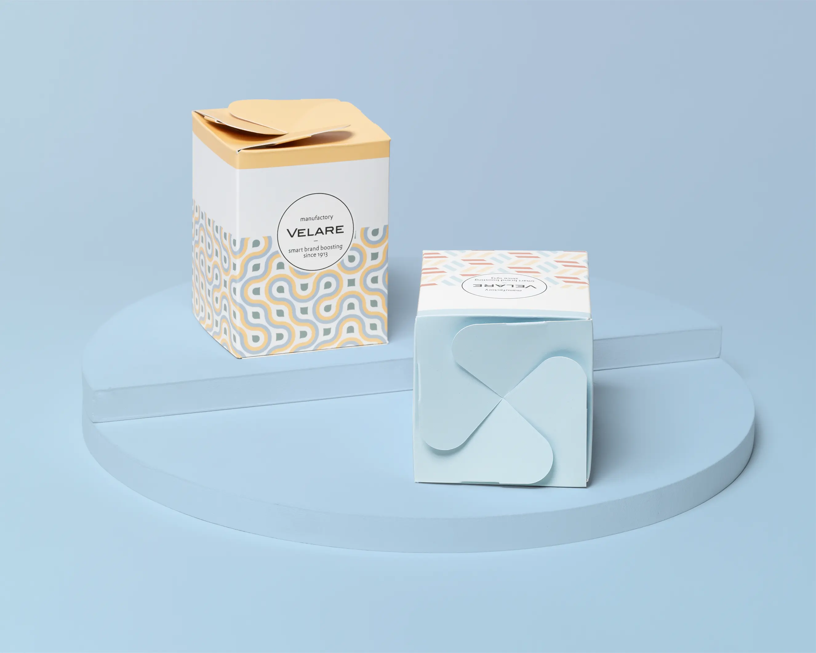 Kartonagen mit Fokus auf Ästhetik, oft mit Schleifenverschluss oder Inlays versehen, um Produkte präsentationsfertig zu verpacken.